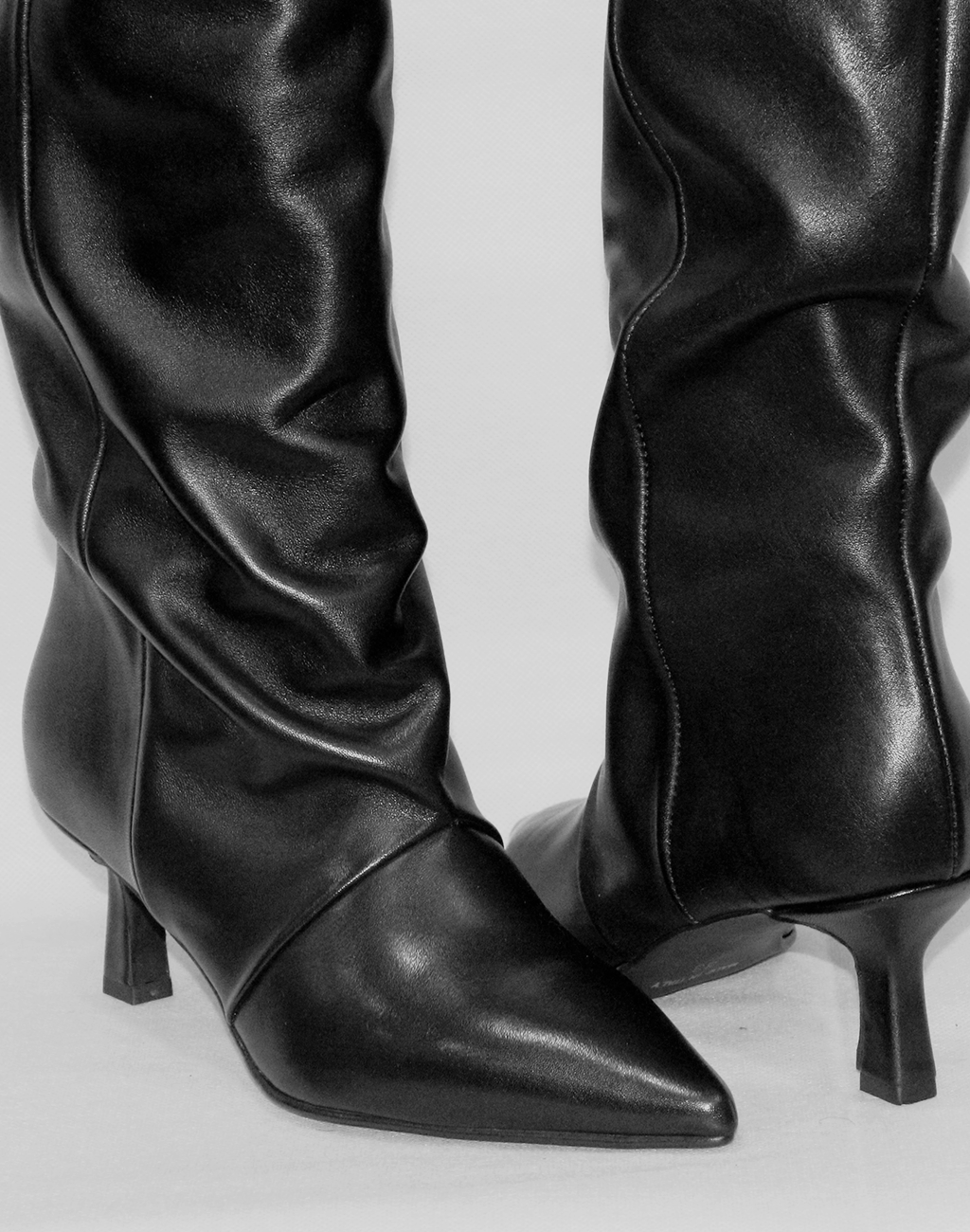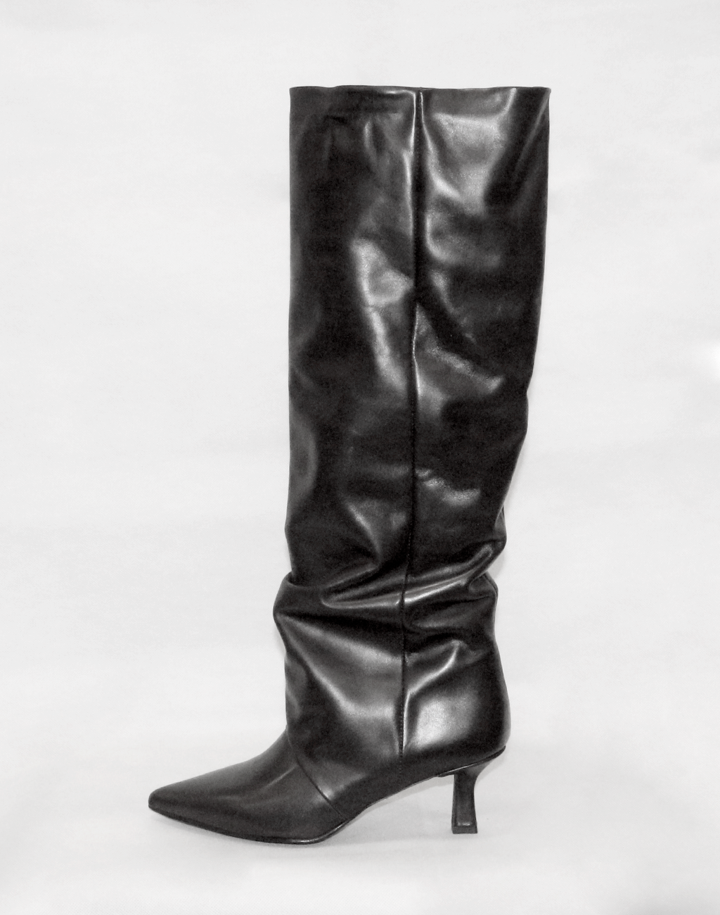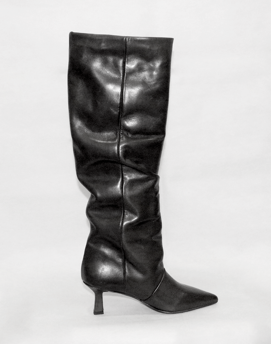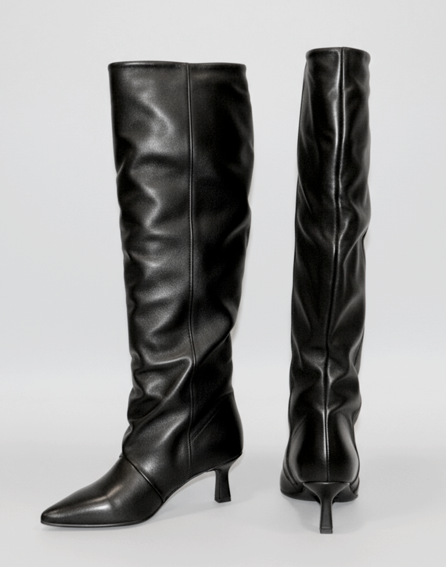 Stivale alto in vitello nero con fodera in pelle, fondo in tunit e tacco da 7 cm. Design slanciato e femminile.