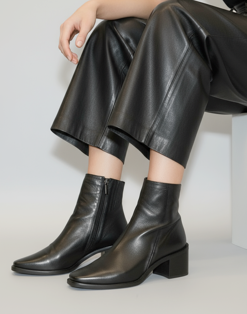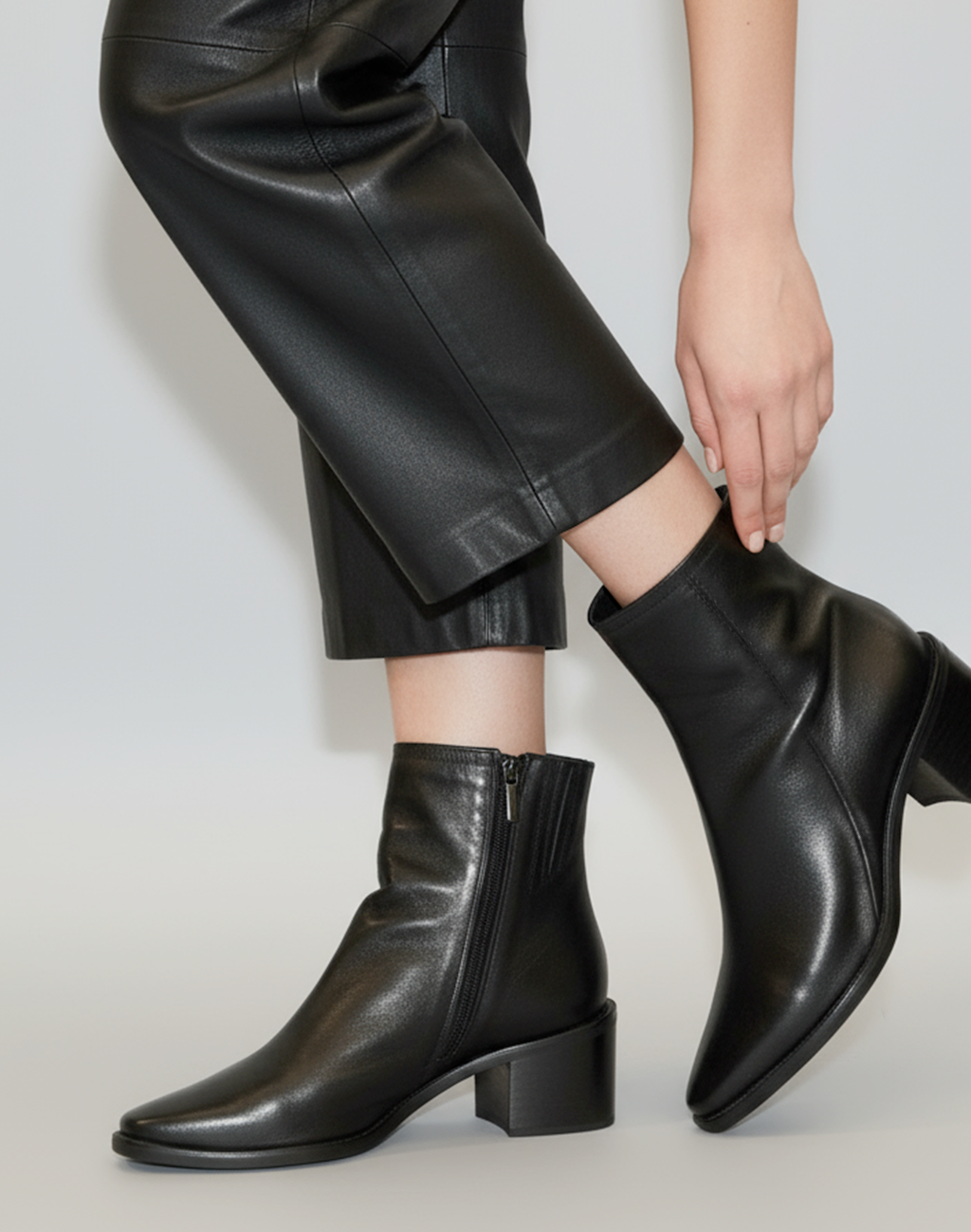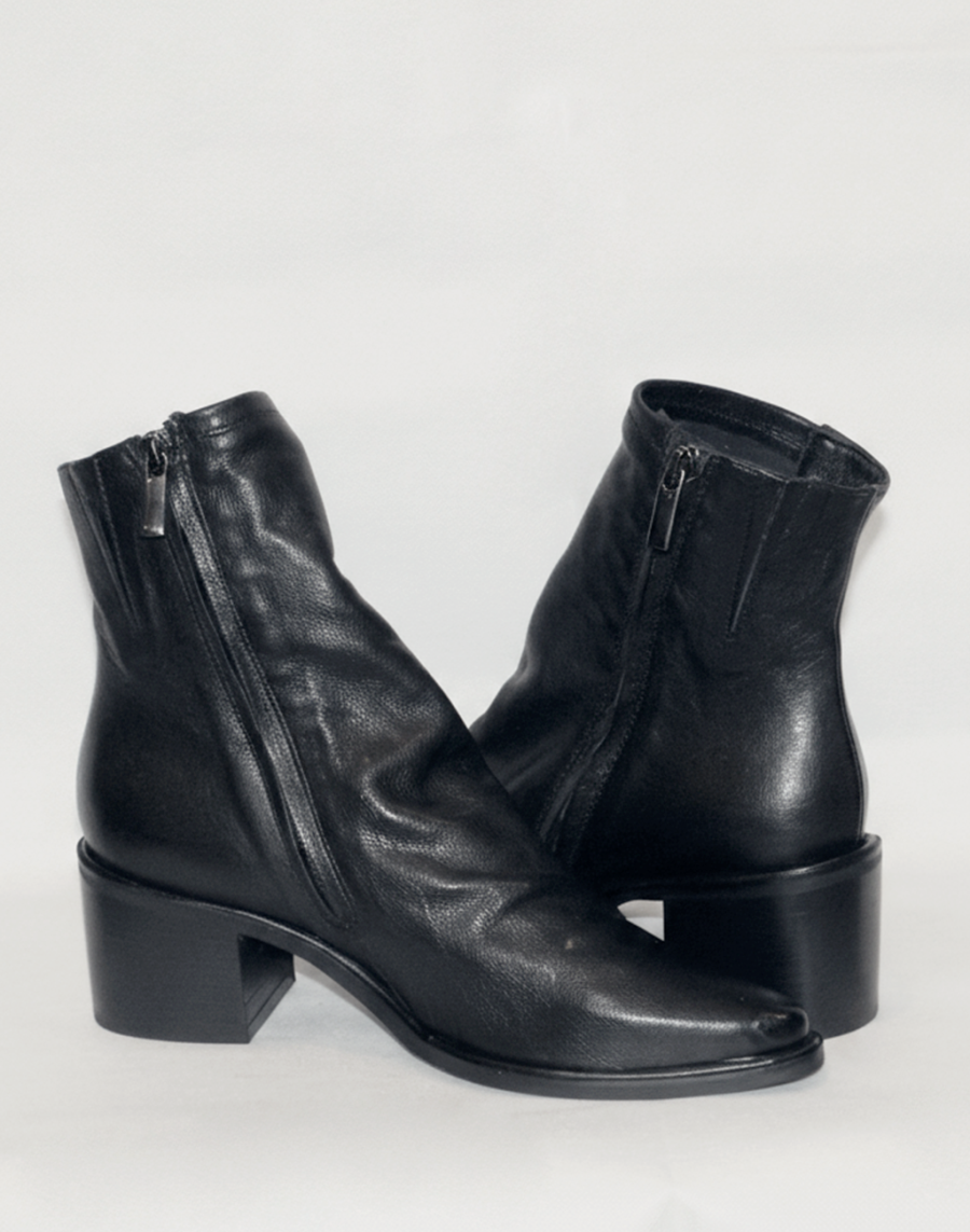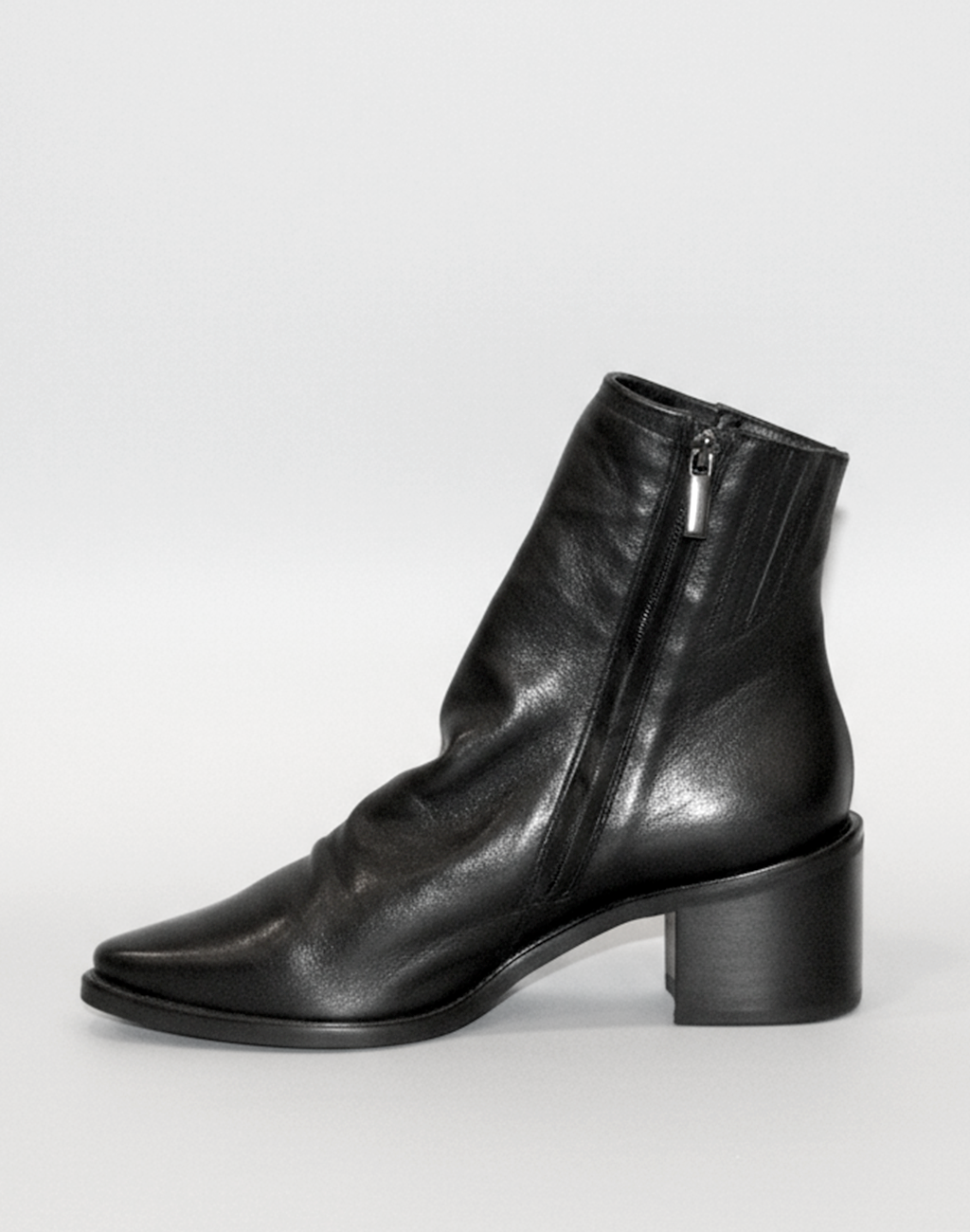 Tronchetto minimal in vitello nero con chiusura zip interna. Fodera in pelle, fondo in tunit e tacco medio da 5 cm.